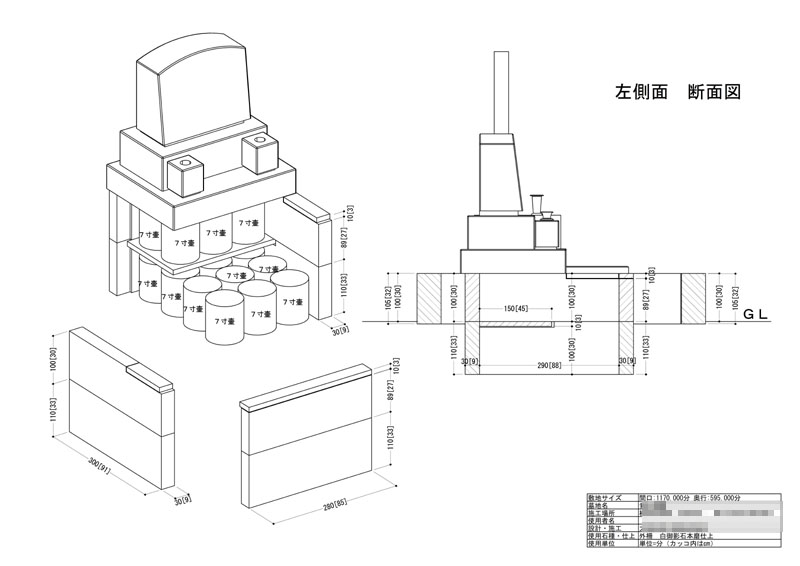 また墓所左側のスペースへ新たに洋型墓石を設置し、既存のカロートもみかげ石で作り直したいとご希望をいただき、落ち葉などゴミが溜まったときに掃除がしやすいことも条件でしたので、以上を踏まえてこちらの図面でご提案させていただきました。