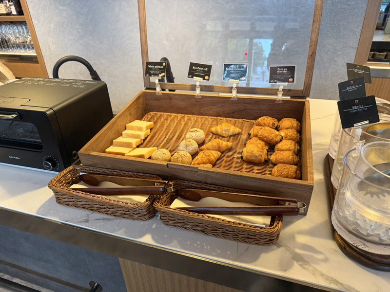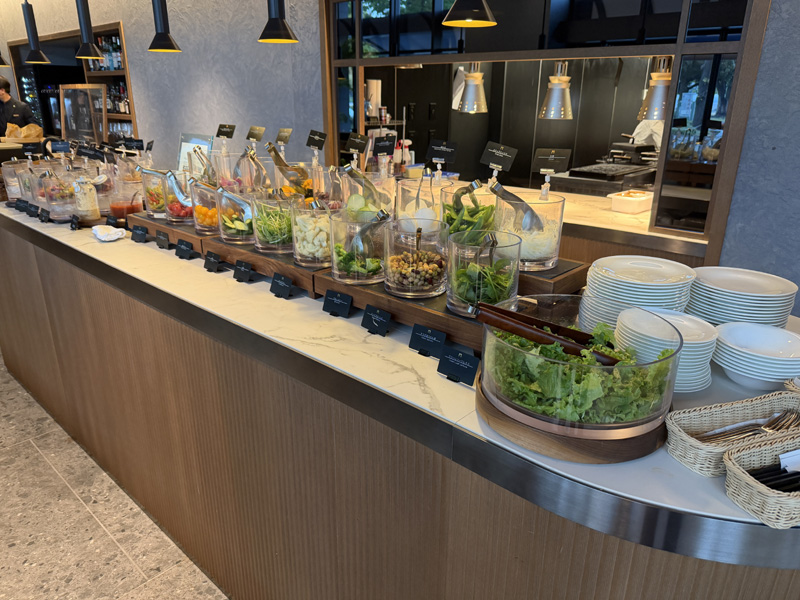 ビュッフェコーナーには彩り豊かなサラダや焼き立てのパンがずらりと並びます。